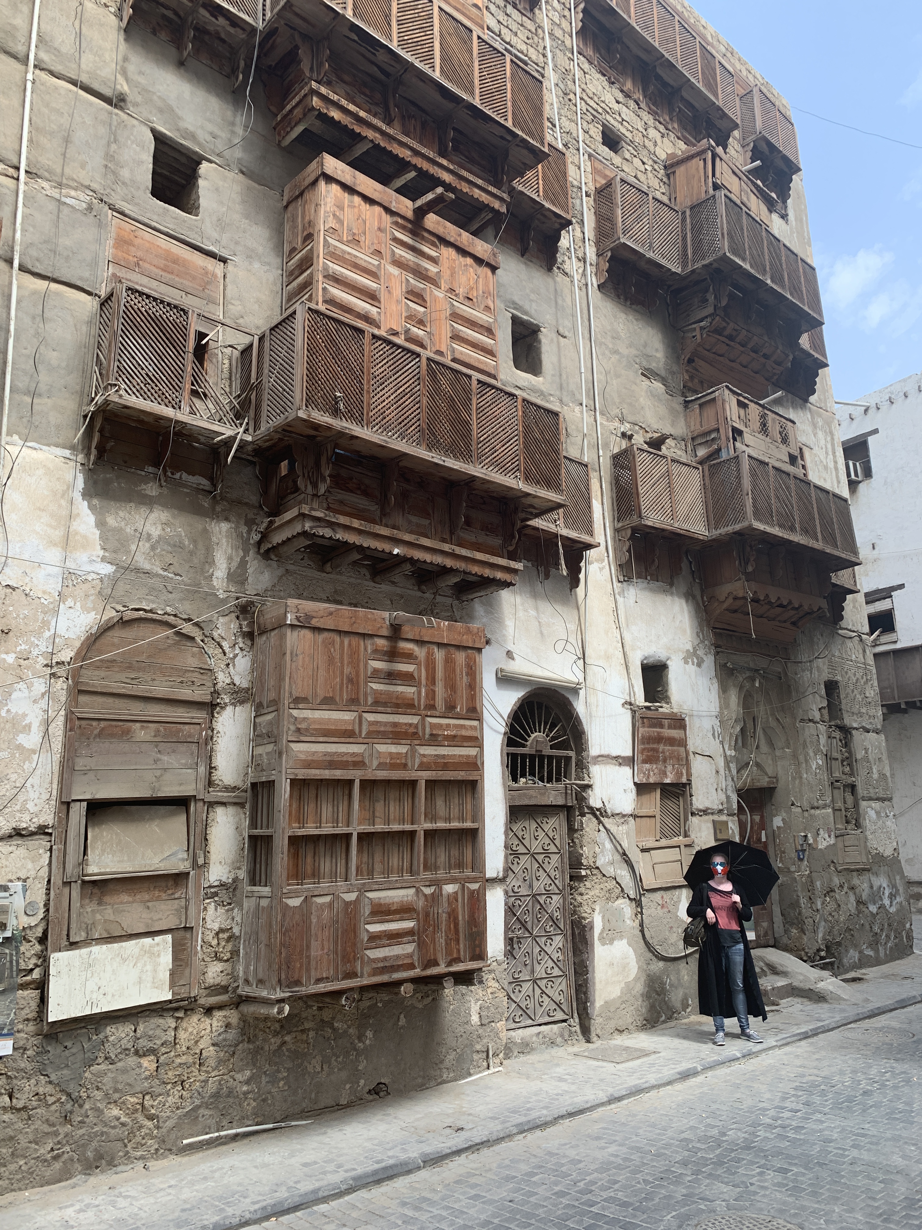 Old Jeddah is in disrepair, but is being restored as part of new Tourism push in Saudi. Old Saudi is known for the wood Roshan on the outside of the buildings. The wood prevented people from seeing the woman inside the house, but allowed air flow for cooling. The amount of Roshan was a sign of the wealth of the family.