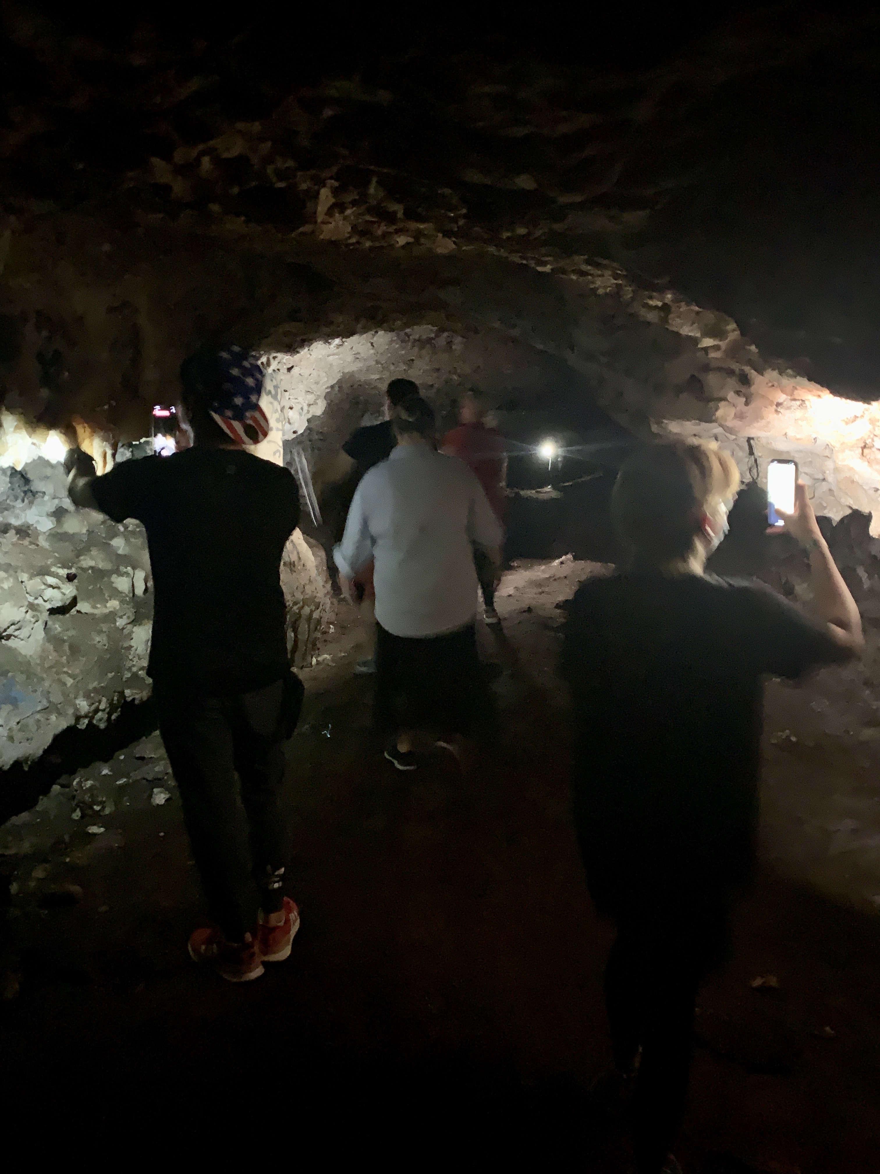The cave was fairly long. It was super hot and humid inside. And bats were flying around.